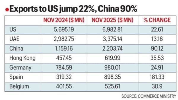 India’s goods exports in November jumped 19 per cent, aided by a weaker rupee and strong demand across markets, including China, Europe, and the US, particularly for products exempted from tariffs, helping narrow the trade deficit to a five-month low of $24 billion, data released by the Commerce and Industry Ministry showed on Monday.